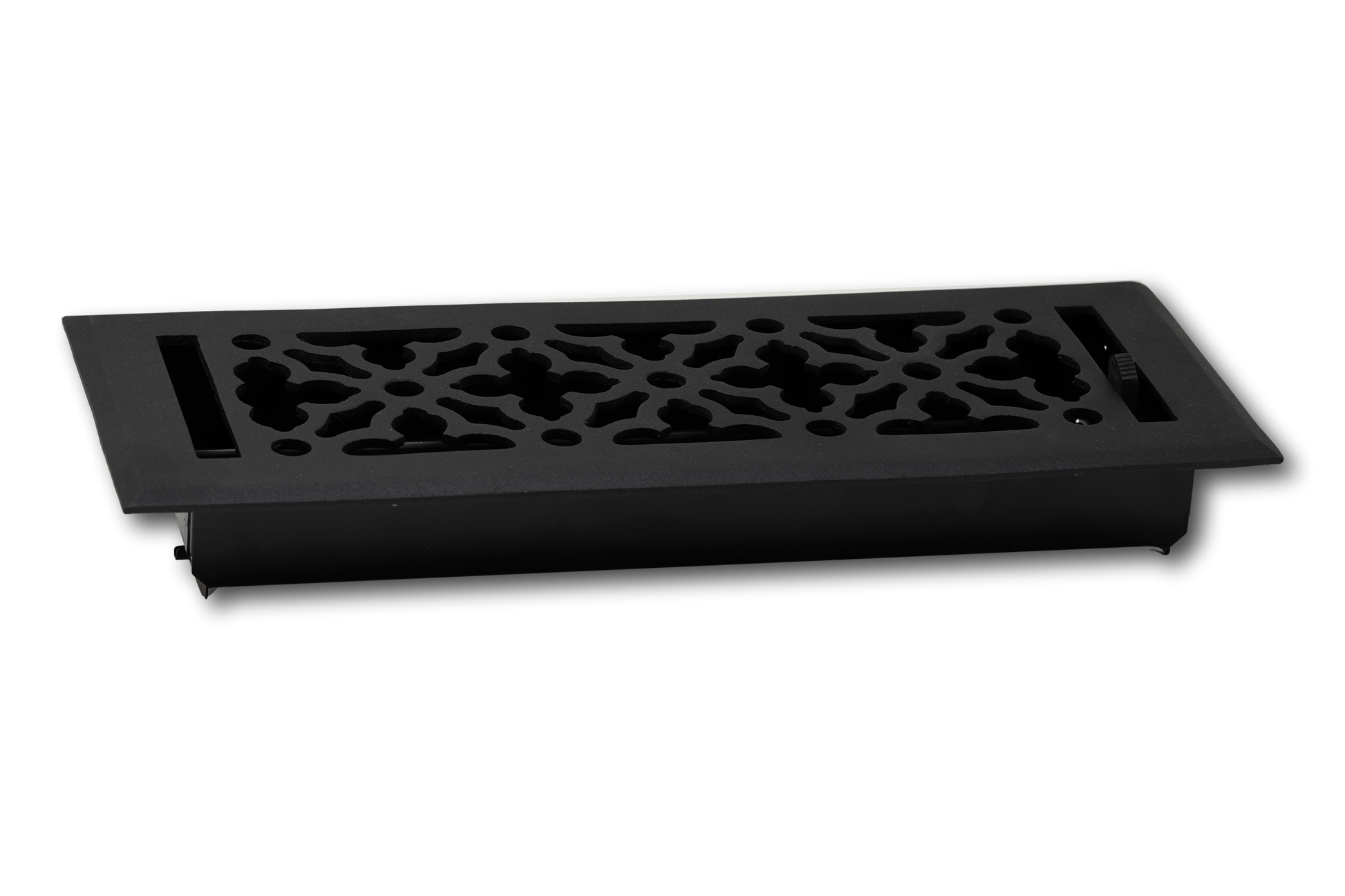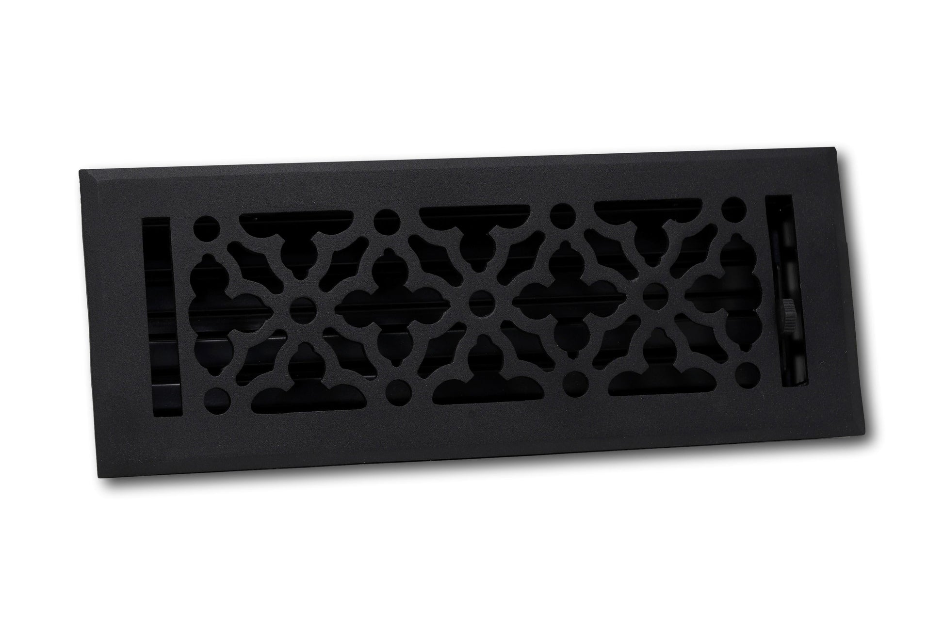 This black Gothic vent cover is made from cast aluminum and has a matte finish. The versatile finish is a perfect blend of traditional and modern styles. The design of the cover is timeless, with a textured flat black finish that resembles cast iron. These rust-resistant covers are long-lasting and add an elegant touch to any home. They can easily match existing decor, providing a seamless look.