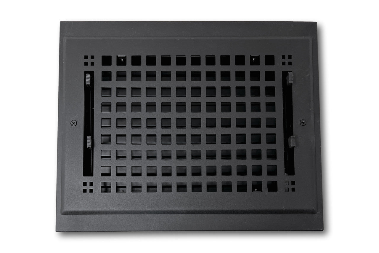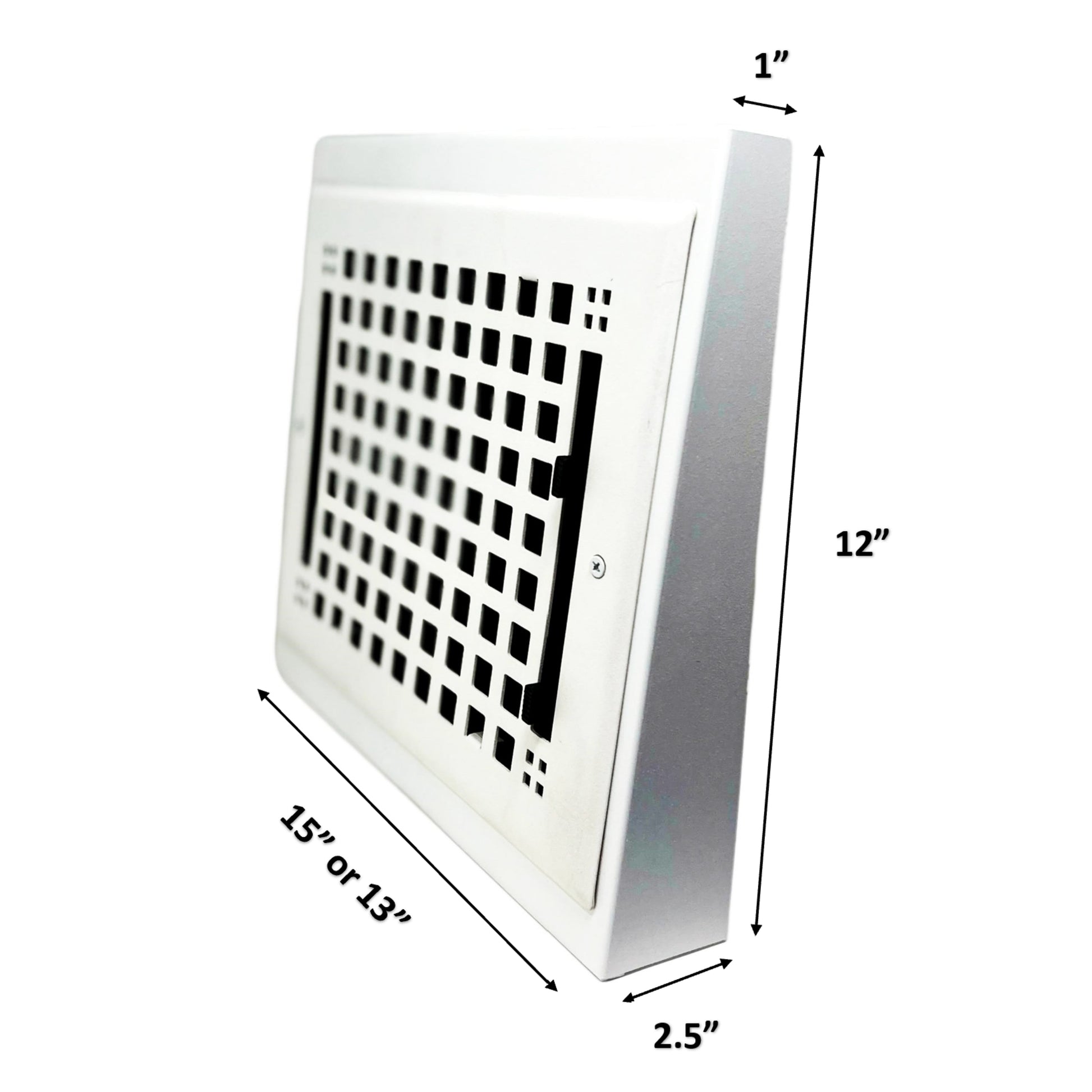 The Madelyn Carter Vintage Baseboard Registers are available in 2 Sizes: 15" x 12" and 13" x 12", 2.5" deep at the base and 1" at the top. Comes in two pieces (sold as one unit) a baseboard frame and register insert (with damper). Simply mount the frame to your wall using the provided 3" screws and then install the insert with damper using the two 1/2" screws.